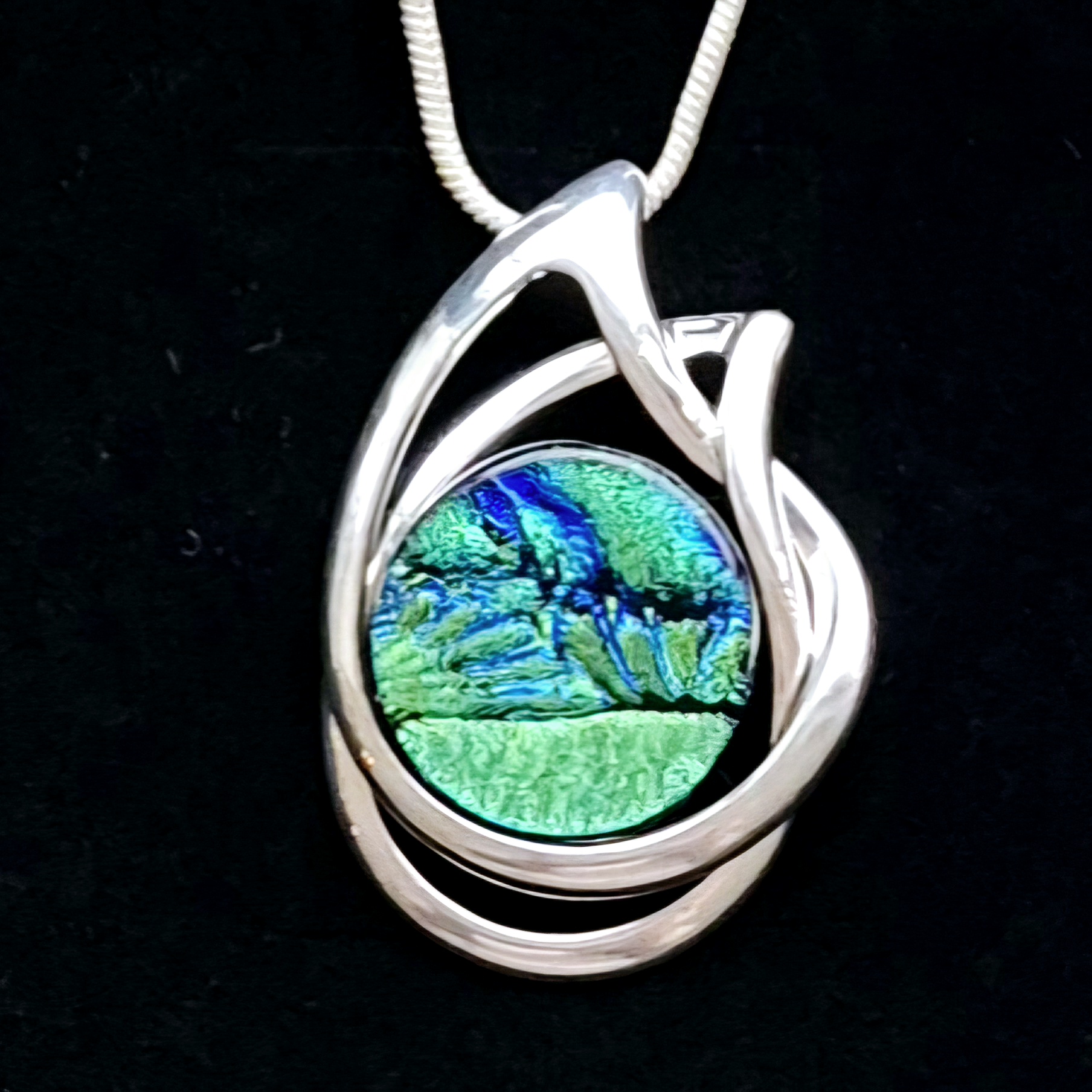 Halsband 2,8x4 cm, med handgjord glascabochon. Infattningen är en nickelfri stomme med en tjock silverplättering. En 2mm ormlänk ingår, 45 cm. Om du önskar en annan längd (40, 50, 55 cm) så skriv det i meddelandefältet vid beställning.