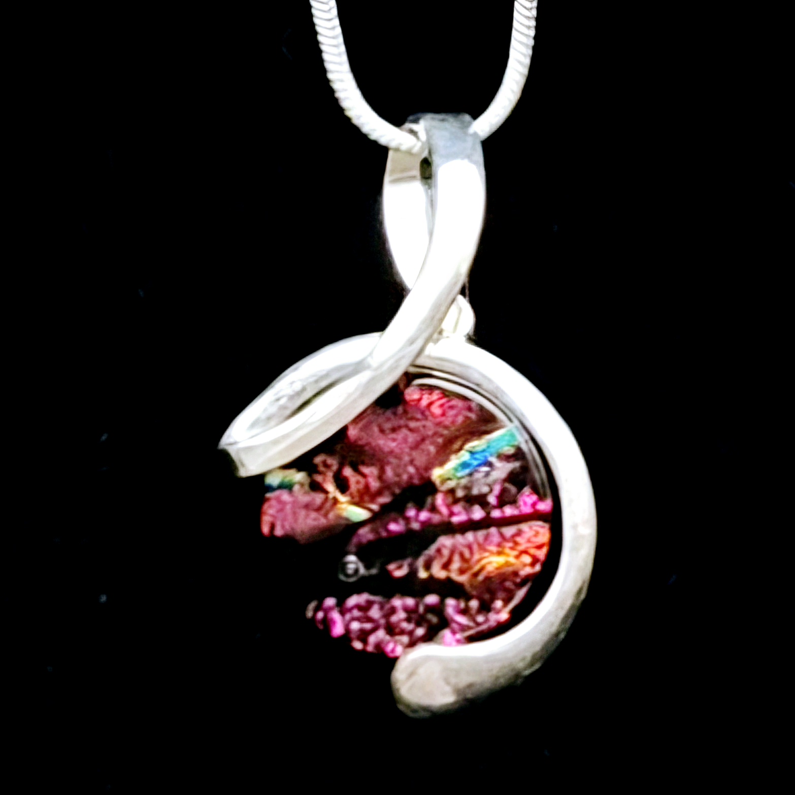 Halsband 2,8x4 cm, med handgjord glascabochon. Infattningen är en nickelfri stomme med en tjock silverplätering. En 2 mm ormlänk ingår, 45 cm. Om du önskar en annan längd (40, 50, 55 cm) så skriv det i meddelandefältet vid beställning.