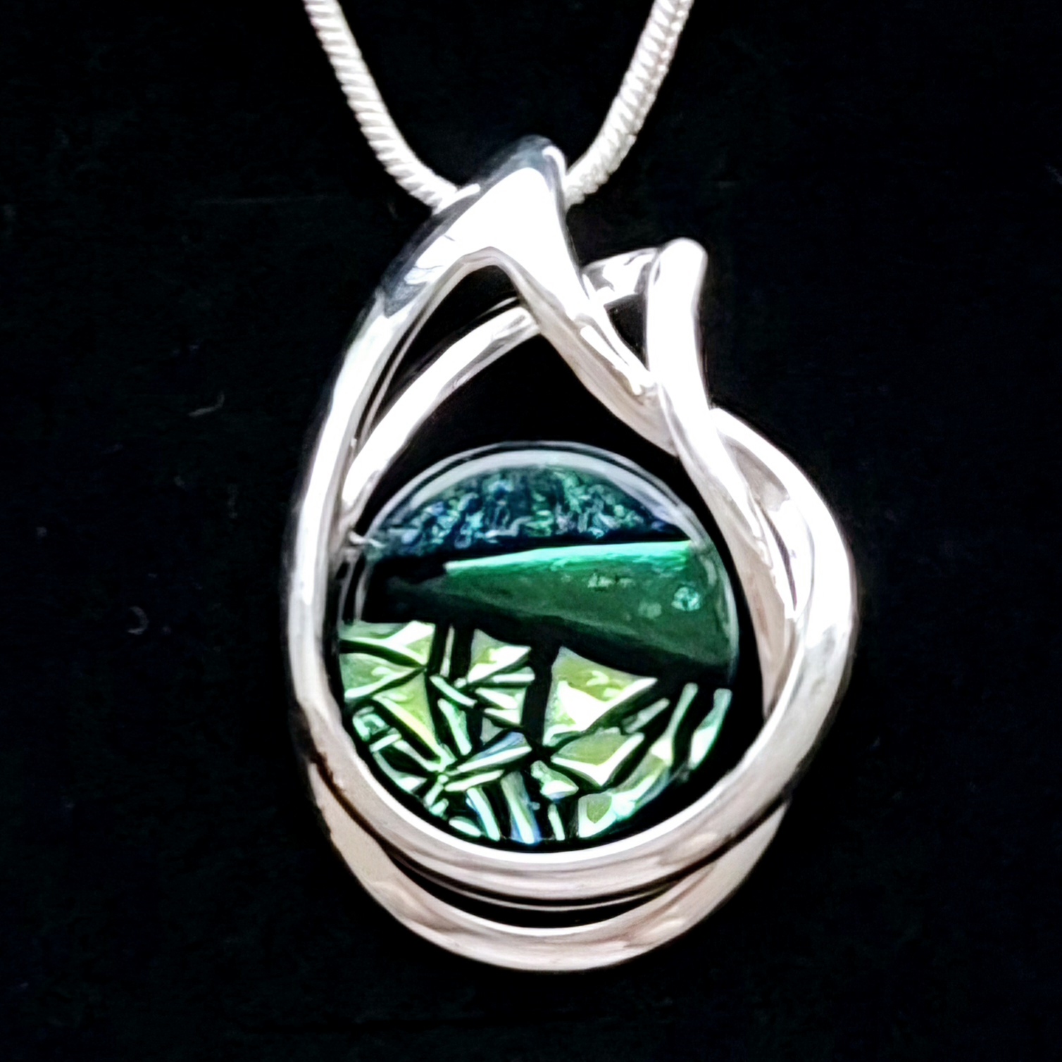 Halsband 2,8x4 cm, med handgjord glascabochon. Infattningen är en nickelfri stomme med en tjock silverplättering. En 2mm ormlänk ingår, 45 cm. Om du önskar en annan längd (40, 50, 55 cm) så skriv det i meddelandefältet vid beställning.
