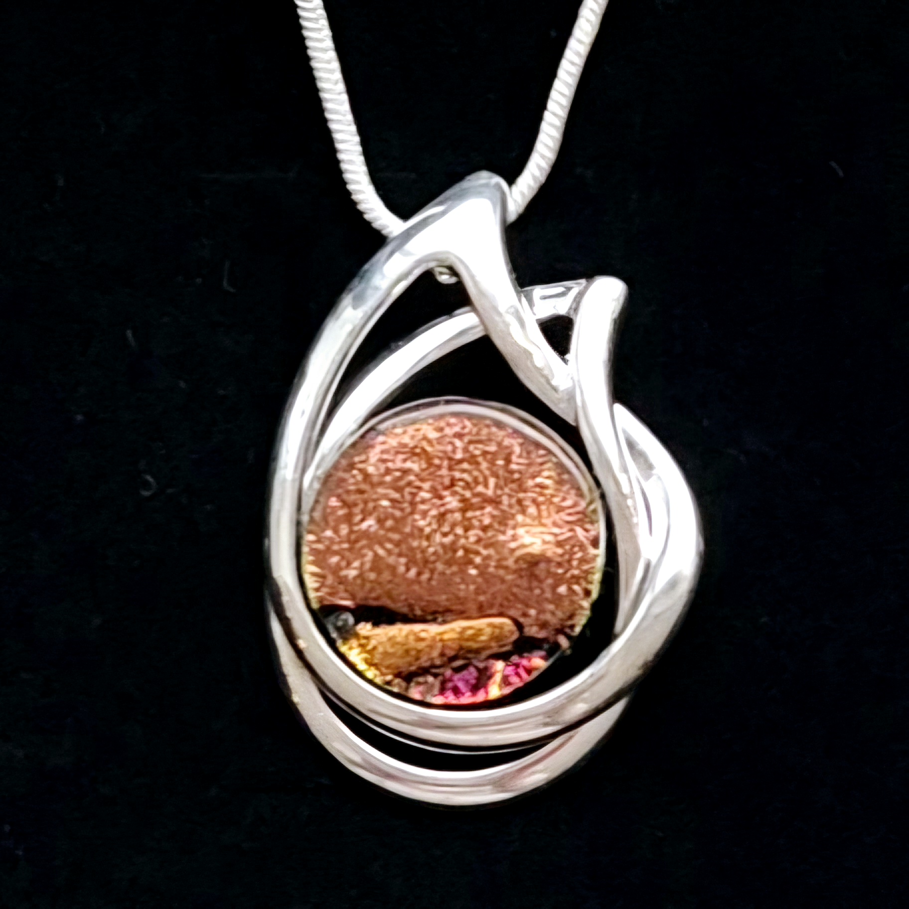 Halsband 2,8x4 cm, med handgjord glascabochon. Infattningen är en nickelfri stomme med en tjock silverplättering. En 2mm ormlänk ingår, 45 cm. Om du önskar en annan längd (40, 50, 55 cm) så skriv det i meddelandefältet vid beställning.