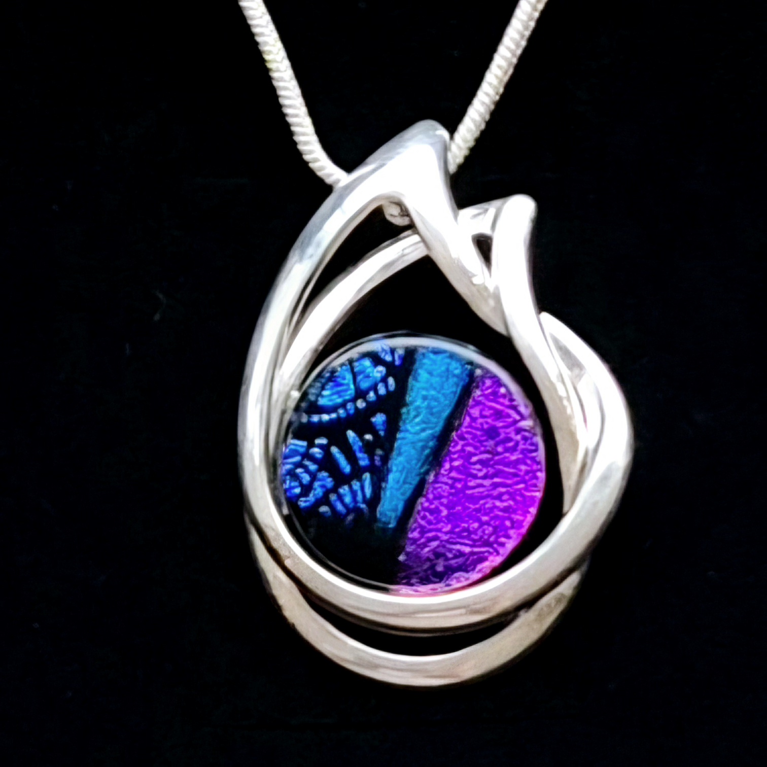 Halsband 2,8x4 cm, med handgjord glascabochon. Infattningen är en nickelfri stomme med en tjock silverplättering. En 2mm ormlänk ingår, 45 cm. Om du önskar en annan längd (40, 50, 55 cm) så skriv det i meddelandefältet vid beställning.